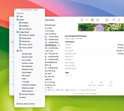 > Information shown below a file’s thumbnail by Quick Look is governed by the type of file concerned. Select a document of the type you want to change, Ctrl-click for the contextual menu and select Show Preview Options there. Currently this seems to have a mind of its own and might also be controlled by apps you have installed.