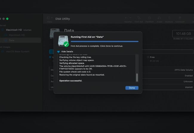 Once you’ve got your Mac running in Recovery mode, open Disk Utility there and run First Aid on your startup volumes.