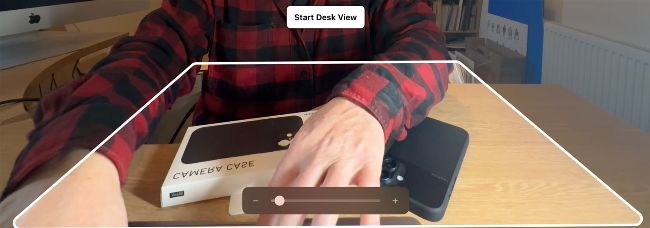When setting up Desk View, drag a slider to focus on the area that you want to view as from above. The preview’s perspectival distortion and inverted text will be corrected by software.