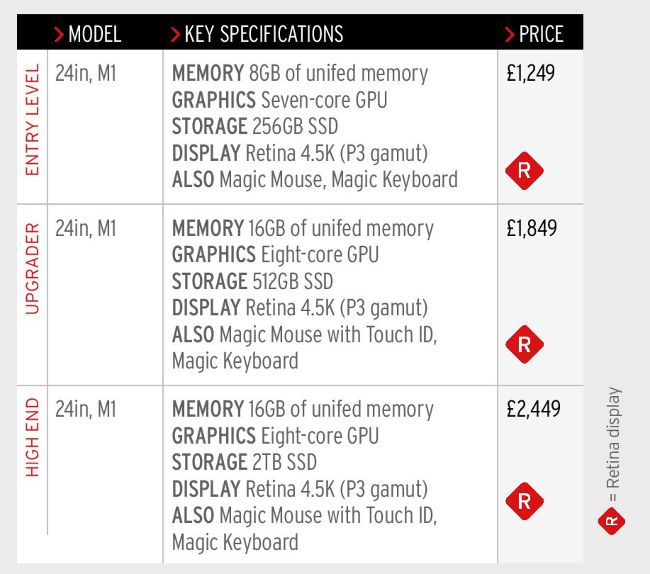 The new iMacs all feature a 1080p FaceTime camera, a highfidelity six-speaker system, a studioquality three-mic array and support for spatial audio. You’ll also find two Thunderbolt/USB 4 ports on each model, with middle-and high-end options gaining two additional USB-C ports. Thunderbolt 2, HDMI, DVI and VGA are supported using adaptors. All come with a Magic Keyboard, with the mid-and highend versions boasting Touch ID. Prices start at £1,249.