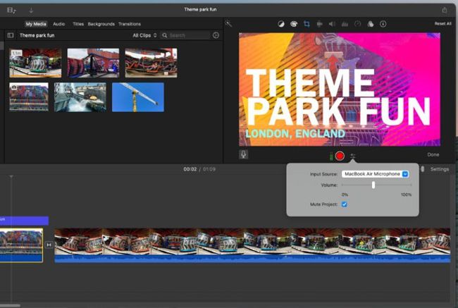 Click the microphone under the viewer window, then click the Settings icon to the right of the red Record button. Choose an input source from the menu. Set the volume using the slider. Click Settings again to close.