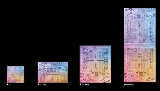 The M1 line-up introduced the now familiar silicon chip variants. Note the two M1 Max chips making up M1 Ultra thanks to UltraFusion.