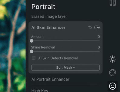 In the Looks menu, you will find preset Portrait treatments that can be applied to a whole image with a 0-100% slider for quick results.