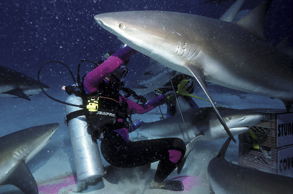 SHARKS HAVE A HIERARCHY and defer to larger sharks. None of them wants to get injured by another shark, so when dead bait is offered, there is little sense of competition among the animals. When I, in years gone by, compared the different shark-feeding operations in the Bahamas, in some