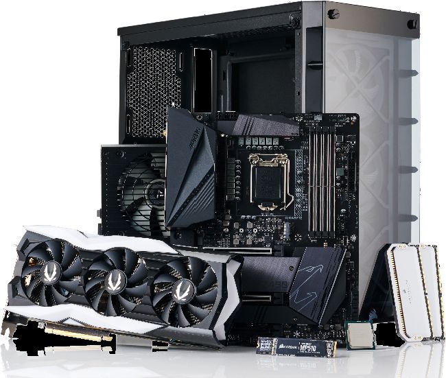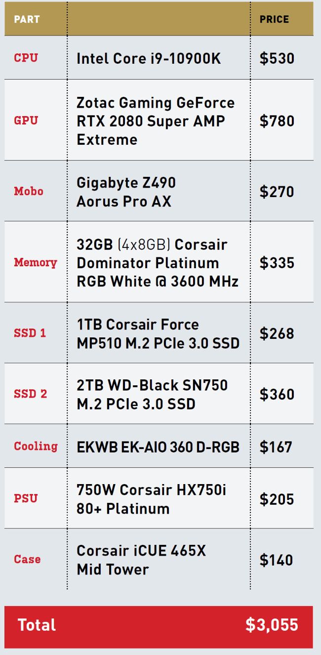 OKAY, WITH this build we’re actually not aiming to hit a specific price point here. In fact what we’re secretly trying to do is use this as an opportunity to pit Intel’s Core i9-10900K 10-core processor against AMD’s Ryzen 9 3900X in a fair fight. That 3900X currently lives inside of our December issue’s liquid-cooled build, complete with 32GB of G.Skill Trident Z RGB DDR4 @ 3600, and features twin EVGA RTX 2080 Super XC Ultras (a quick SLI disable will solve there being two of those).
