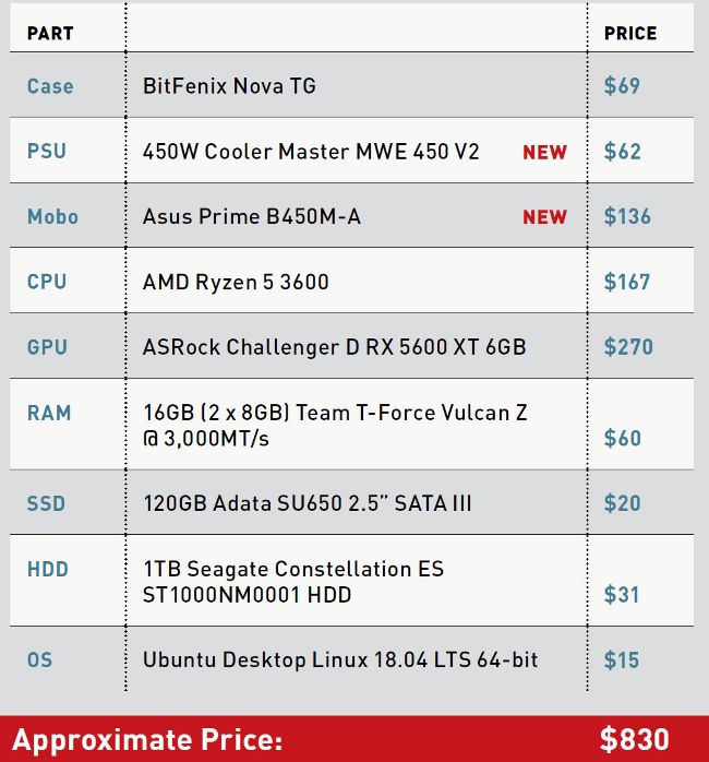 Motherboards proved a pricey problem for our AMD build, where we’ve had to swap over to the Asus Prime B450M-A, a slightly smaller Micro ATX board than the previous MSI Pro B450M. Bear in mind that if you don’t buy the Asus mobo new, you may need a 2nd-generation AMD CPU in order to flash the BIOS for Ryzen 3000 compatibility. We’re not changing much else on the AMD build, though. The 120GB SU650 drive from Adata has dropped in price again, making it an absolute steal at just $20.