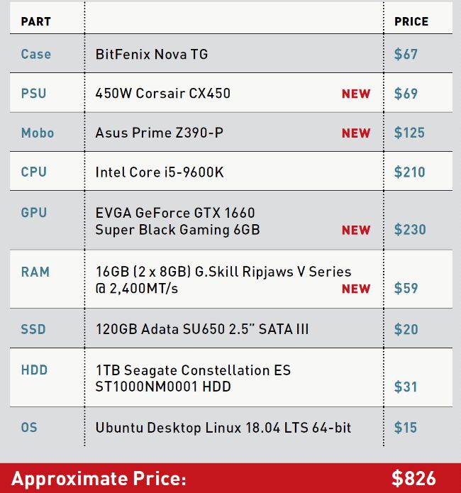 We’re shaking things up a bit more over in the Intel machine. First up, the previous motherboard is no longer on sale, so that’s gone. Replacing it is another Asus Prime board, the eye-catching Prime Z390-P. We’re shaving $10 off the overall price by switching over to EVGA’s single-fan GTX 1660 Super Black Gaming, then a few dollars more by changing up the memory for G.Skill’s Ripjaws V Series RAM at the same capacity and speed we had before.