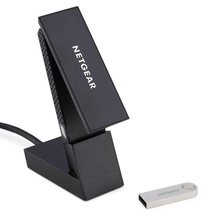You get two main components in the box with the Netgear Nighthawk A8000. First is the Wi-Fi 6E antenna, which looks like a chunky USB drive and folds out to form an antenna. Second is a dock for this antenna, which connects to your laptop or desktop computer via a USB-A cable. You can either plug the antenna straight into your computer, or use the cradle if it’s more convenient for your particular setup or will get a stronger signal.