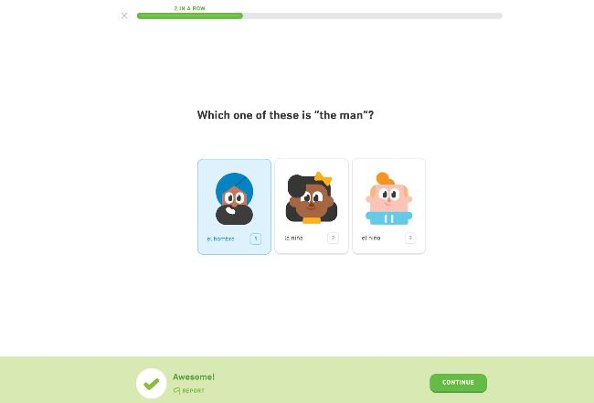 Cartoon-style graphics lend Duolingo a learn-whilehaving-fun air.