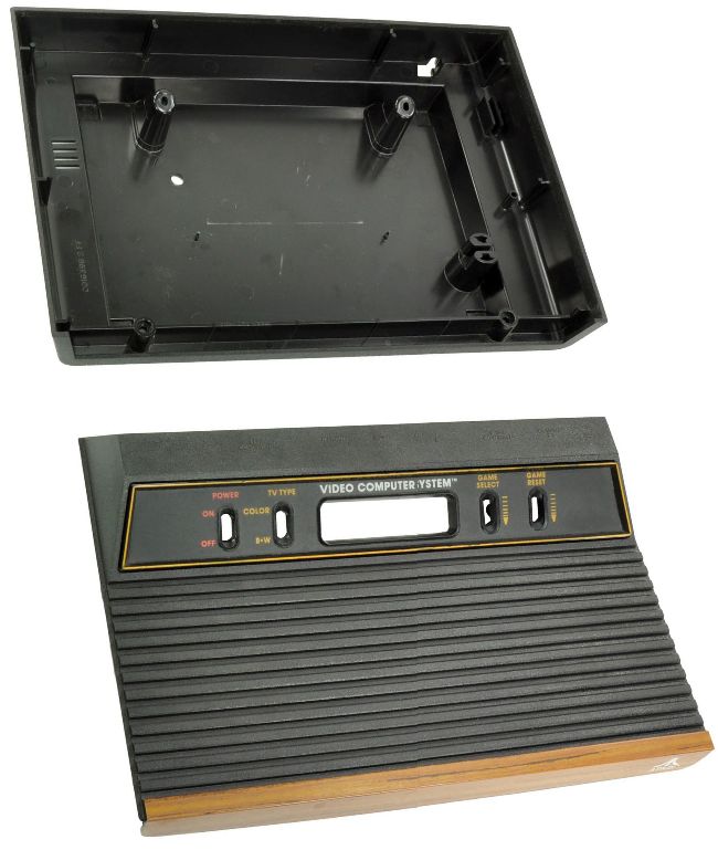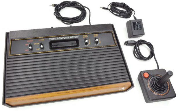 The Atari 2600, with AC adapter and iconic joystick controller. Does the 2600 have a hardwood finish? You are correct!