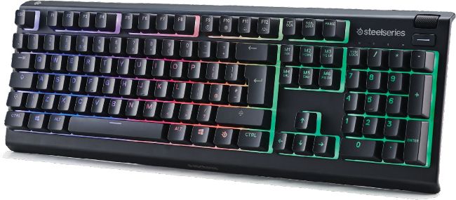 THIS IS THE BLACK SHEEP of SteelSeries’s Apex line, a lone membrane keyboard in a collection of mechanical offerings. It is by far the cheapest Apex keyboard, costing just 50 bucks (every other Apex keyboard costs upwards of $100), and it’s easy to see why: This is the toned-down version of the Apex chassis, a simplified model that forgoes per-key illumination and the little OLED smart display that defines its fellow keyboards.