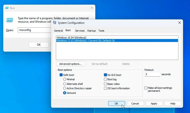 » You can do this via Settings, but it’s a long, convoluted process that requires rebooting to the Advanced Startup Menu. A far simpler option is to press Win + R, type msconfig, and hit Enter to open the classic System Configuration tool. Switch to the Boot menu, select your target Windows installation (if applicable), then check Safe boot and select Network, as shown in [Image A] . Once done, click OK—you’ll be prompted to restart, but you can ignore this for now (click ‘Exit without restart’) if you’re not yet ready to reboot.