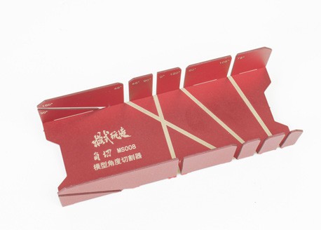 This mini mitre box, formed from an etched sheet of 0.9mm thick nickel silver, features a stylish anodised red finish. Supplied flat, the two sides simply need to be folded up to sit at right-angles to the base, so a set square will help when setting it up.