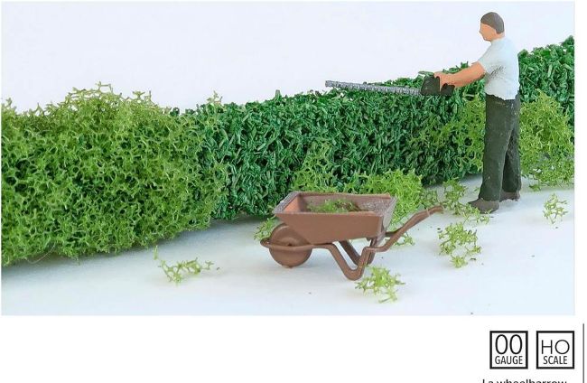 This useful pack by Busch provides a fast way to create a cameo scene that is rarely modelled: the garden hedge has started to look a bit messy, so the local gardener has been engaged to trim it. The pack includes an 11cm length of partially cut hedge, plus leaf debris.