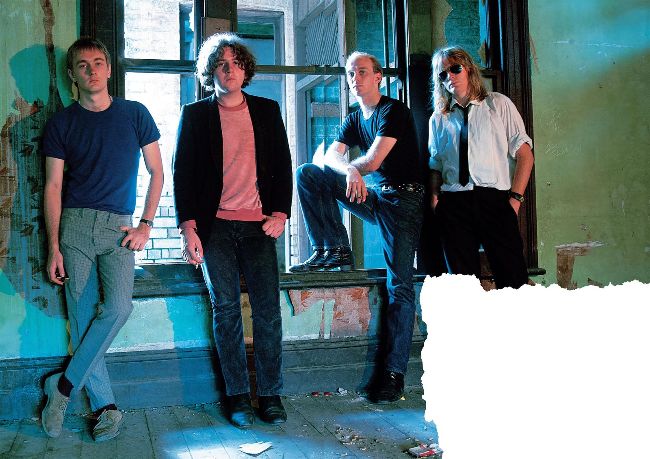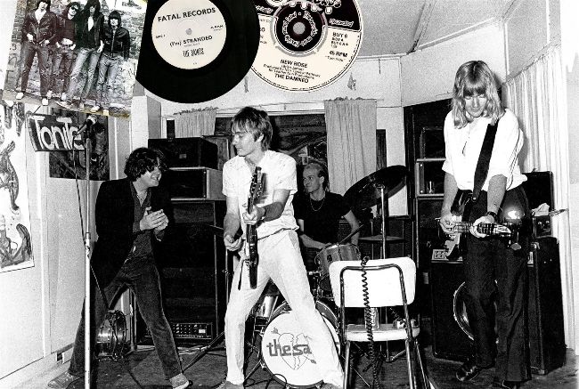 Angelic upstarts: The Saints rocking Club 76, their live-in venue at 4 Petrie Terrace, Brisbane, (from left) Bailey, Kuepper, Hay, Bradshaw; (insets) 1976 original punk blueprints (from left) Ramones, The Saints’ self-released 45, The Damned’s New Rose.