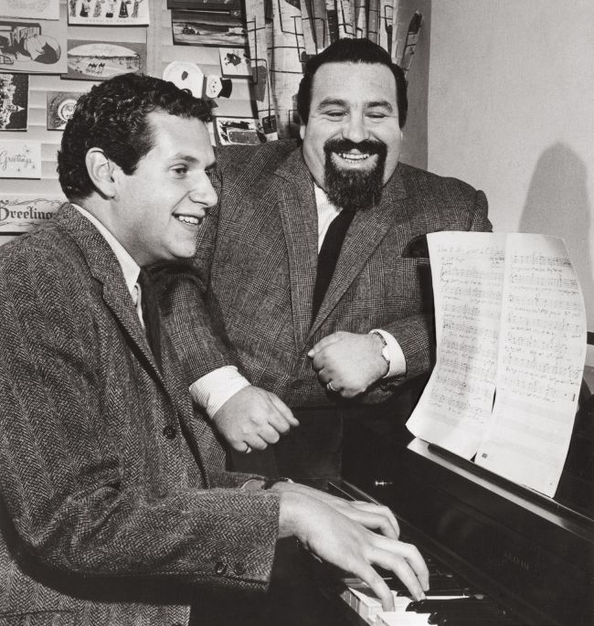Medicine heads: (left) Doc Pomus sings at the Pied Piper club, NYC, September 1947; (right) in his Brill Building office with co-writer Mort Shuman, 1961.