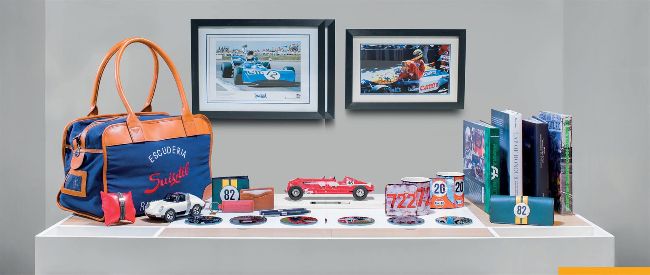 A. ‘Escuderia’ Suixtil track bag, cotton with leather trim, navy and tan, £225 | B. Lithographic print of Jackie Stewart’s 1971 Tyrrell 003, signed, £124.96 | C. ‘Taxi for Senna’ limited edition print, signed by Nigel Mansell, £99.95 | D. F1 Retro 1980 by Mark Hughes, £40 | E. XKD 603: Through the Lens of Time, by Clive Beecham, £95 I F. Lap of Honour:A Photographic Journey with Sir Stirling Moss, by Tim Hain, £45 I G. Formula Helmet: The Glorious Years of Formula 1 Helmets, 1969-1999, by Bruno Bayol, £115 I H. No.82 Lotus retro leather glasses case, £25 I. Retro mug and coaster sets: coasters £7, mugs £12 | J. Speedometer glass coasters, set of six, £20 | K. 1932 Tim Birkin ‘Blower Bentley’ model, 1/18, cast in resin, £270 | L. Motor Sport branded essentials: Balmain leather card holder £24.99, embossed leather keyring £10, pens £5.99 |M. No.82 Lotus retro leather wallet, £30 I N. Playforever ‘Luft’ model, £35 I O. Mongrip Portier unisex bracelet, made from recycled F1 tyres, £195