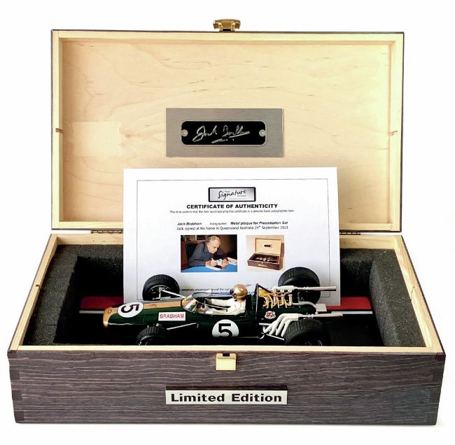 It’s arguable that, amongst the pantheon of F1 greats, not enough gets said about Jack Brabham. The pioneering Aussie was already a two-time world champion with Cooper when he decided to try to win a title driving a car of his own creation. He achieved it in 1966, with four wins aboard his Brabham-Repco. This set features a 1:18 scale model of the Brabham BT20 used in 1966-67, with the signature of Brabham himself on the lid inlay. £249.95