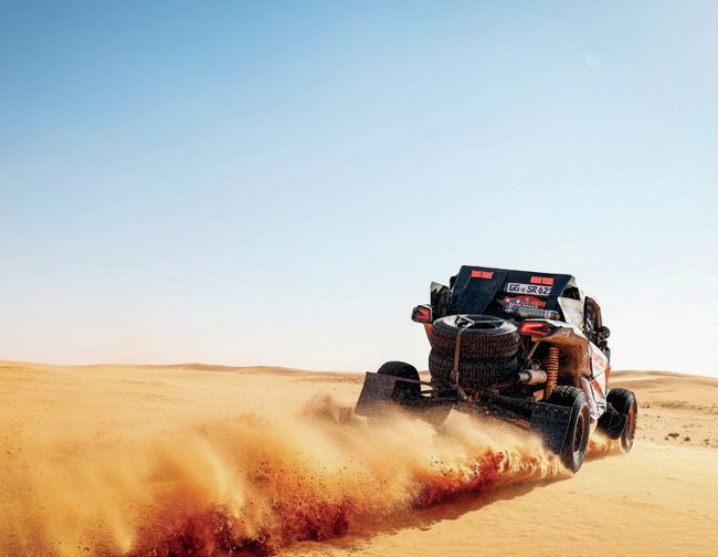 Hearing the high-pitched whining of a turbo, I peer out the dusty back window of our Toyota Land Cruiser to see an off-road prototype bearing down on us at some rate of knots as dust plumes up behind it.