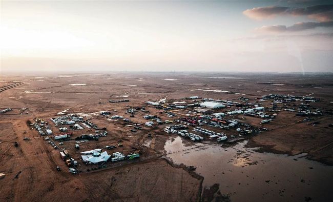 Bivouac-y racers: the moving city at Dakar’s second stage following a desert downpour.