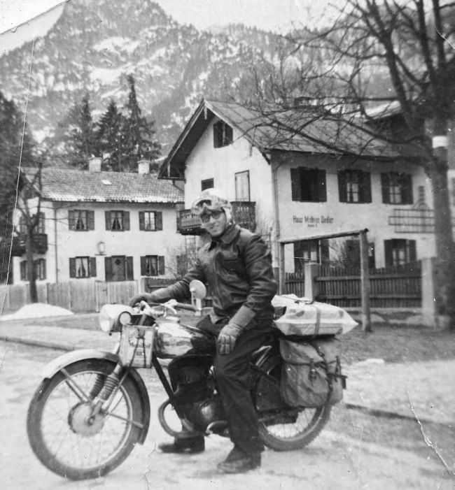 This is my dad, Len Drolet, in Oberammergau, Germany, in 1957. On the back of the photo he had written “you can tell it was mighty cold.” My dad often talks about this motorcycle and the time he spent touring around Europe on it, how he sometimes ended up on rough mountain trails, and even had a friend riding as a passenger at one point, but the bike was super hardy and he had no troubles with it.