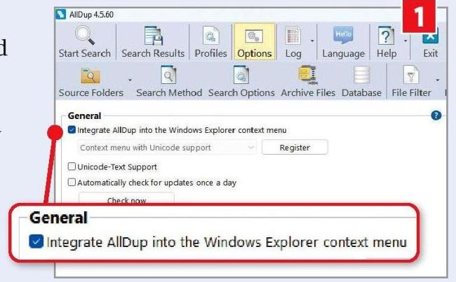 First, you have to launch AllDup then click the Options section at the top and tick the ‘Integrate AllDup into the Windows Explorer context menu’ box (see screenshot 1 ) – I guess AllDup’s developers didn’t get the memo that Microsoft renamed it File Explorer.