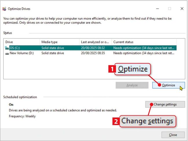 So why does Windows still have a built-in ‘defrag’tool? Well, actually it doesn’t. The tool is now called Optimize Drives but, perhaps sensibly, Microsoft knows people will try to access it by typing defrag into the Start menu. If your PC has a traditional hard drive, Optimize Drives still offers an option to defragment it. Otherwise clicking the Optimize button ( 1 in our screenshot above) on an SSD will run what’s known as a TRIM command, which marks empty blocks on the SSD where, for example, a file has been deleted. The SSD takes less time to write to these because it doesn’t need to erase the previous contents first, as it would if you hadn’t run the TRIM command.