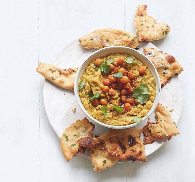 Simmer for 10 minutes, mashing lightly until thickened. Tear 300g naan bread into pieces and drizzle with veg oil. Spread over a baking tray, then bake for 10 minutes until crisp. Heat 1½ tsp ghee in a frying pan, add the reserved 2 tbsp chickpeas and fry until crisp (be careful – they may pop and spit if the pan gets too hot). Add a pinch of chilli powder, then toss in the pan until evenly coated. Season, then serve the dhal topped with the chilli chickpeas and fresh coriander leaves, with the naan for dipping and natural yogurt, if you like.