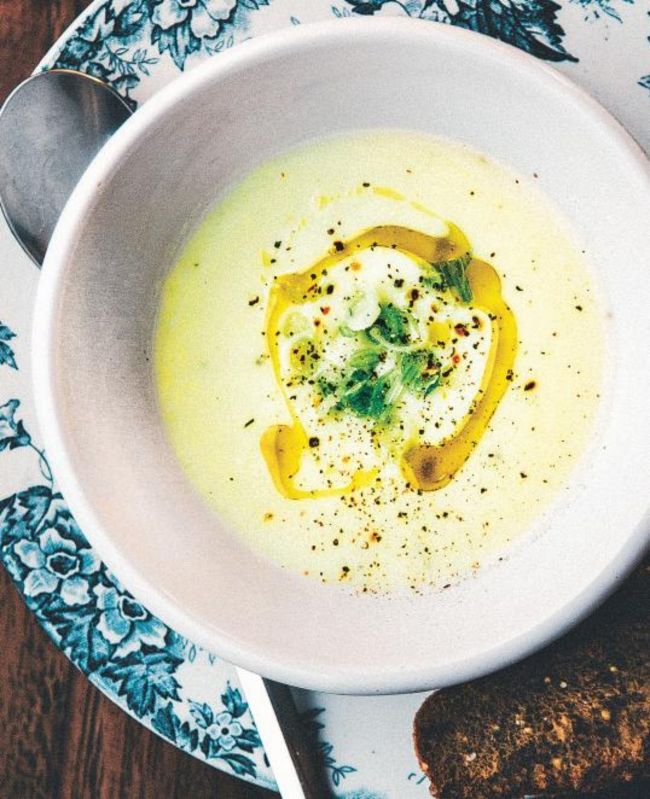 “This comforting potato and leek soup is always a hit. The leeks give a wonderful flavour and the potatoes add substance. It’s based on the classic French vichyssoise, but tweaked by replacing cream with the lighter creaminess of almond milk, almond butter and crème fraîche. Use vegan crème fraîche to make it completely plantbased and substitute the potatoes for jerusalem artichokes, if you like.”