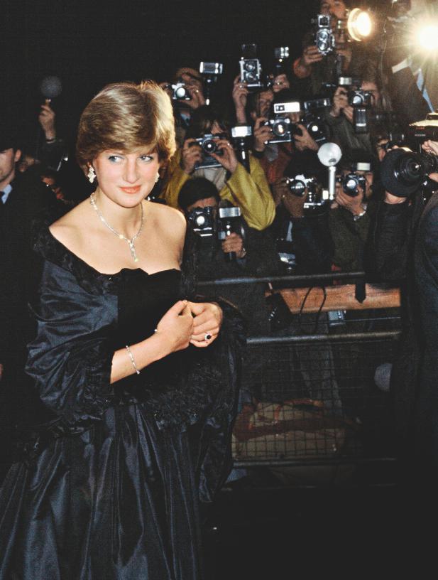This low-cut taffeta gown for Diana’s first appearance after her engagement set flashbulbs popping. It was by the Emanuels – who would go on to make her spectacular wedding dress