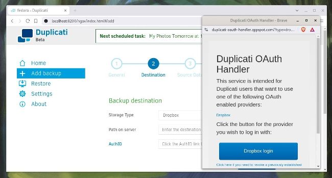 Duplicati has an OAuth handler service to help you sign into and work with virtually all the popular cloud storage services.