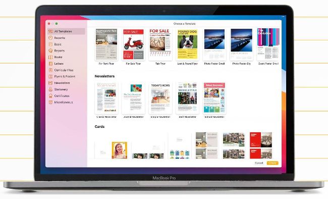 ith this walkthrough, we’re going to create a brochure by starting with one of the templates from the Template Chooser that appears when you first launch Pages. The Template Chooser can also be accessed from the File menu by choosing New. We’ll use a brochure template here, but the principles are the same for all templates.