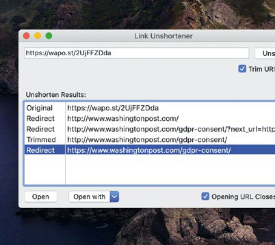 > If this is a one-off, there are many websites which offer to do this, but normally set a tracking cookie in the process. Best now, as it doesn’t trigger cookies or tracking at all, is Link Unshortener from the App Store, which shows all the redirects and can trim URL queries from the link too.