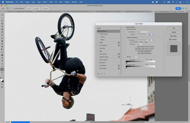 Blend If is a wonder ful tool if there’s a difference in brightness between the background you want to remove, and the one you want to replace it with. So it’s ideal for knocking out a white or black backdrop. You can also use it to target the Reds, Greens or Blues. Double-click the top layer to open the Blending Options. Here you’ll find the Blend If controls.