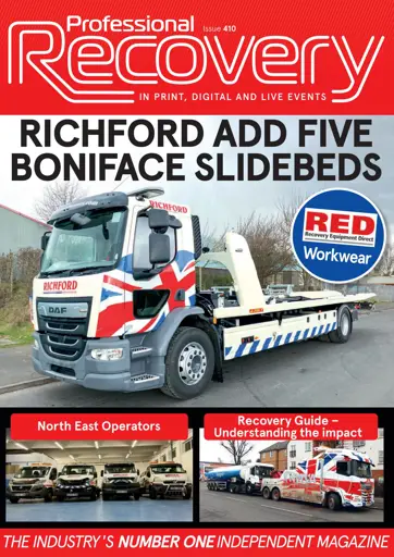Issue 410 of Professional Recovery includes an editorial from Derek Firminger on the latest correspondence from the DVSA, an editorial from Fred Henderson and updates from The IVR and PROF. There are new vehicle handovers from Boniface for FAM and Richford Motor Services and also J&J Conversions for Horne Park. There are features on Workwear and North East Operators plus industry news.