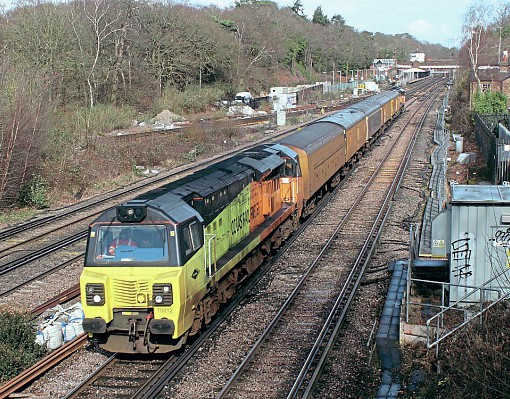 FOR the first time, a pair of Colas Class 70s have been used in top-and-tail mode on a Network Rail infrastructure test train. As part of a trial, Nos. 70810 and 70812 were used on a Eastleigh Works to Eastleigh Works diagram via London Waterloo on March 11, creating a rare sight of the class at the terminus. The trial train is seen passing Weybridge on the return to Eastleigh. The reason for the trial is unknown.