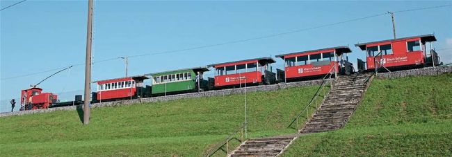 The Rhein-Schauen train seen on top of the flood barrier at Rhy-Schopf near Widnau in Switzerland on October 9, 2021 with a 1949 vintage Stadler built electric loco. The train operates as a round trip from Lustenau in Austria.
