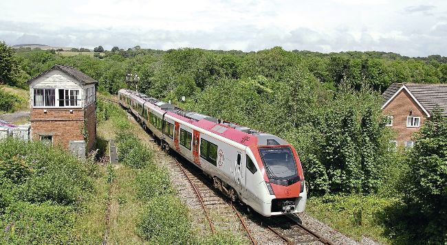 Stadler ‘Flirt’ DMU No. 231007 became the first of the class to work on the Maesteg branch on July 9. It’s seen forming the 3Z31/14.05 Maesteg to Cardiff Canton test trip past the signalbox at Tondu.