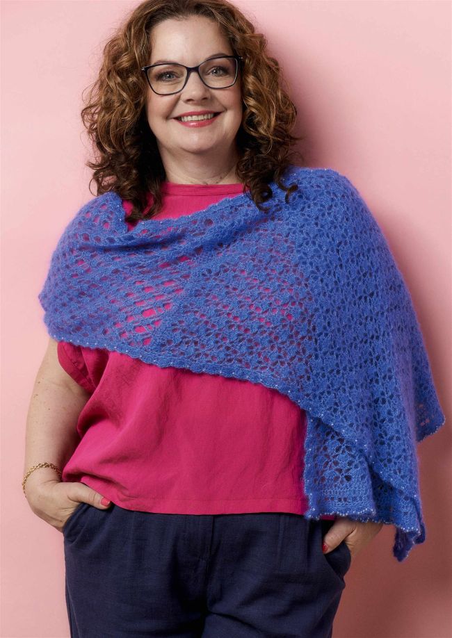 Sara Mulvey of Black Sheep Wools modelled this floaty jewel-toned shawl for us. It’s hooked in one of her favourite yarns, too!