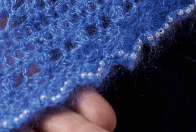 When working the edging, thread beads onto the yarn, then work a round of double crochet