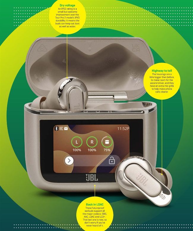 The earbuds themselves are a bit on the large side but high-end, with a combination of 10mm dynamic and balanced-armature drivers delivering sublime, nuanced audio. They build on the JBL Tour Pro 2 model with those dual drivers plus improved hi-res streaming support, longer battery life, and the ability to retransmit audio from just about any other gadget. Active noise-cancelling, spatial audio and a comprehensive app all return as well.