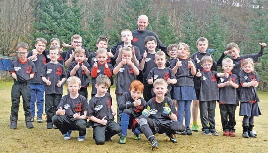 Dunbeg’s Primary School pupils with their football coach Steven Macaulay who is keen to see the village’s sports pitch revamped.