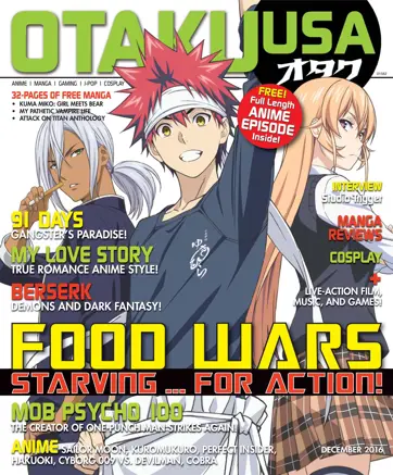 Food Wars!: Shokugeki no Soma; Berserk Returns; My Love Story’s True Romance; Mob Psycho 100; 91 Days: Gangster’s Paradise. Plus full-length Anime Episode; anime & manga reviews; Cosplay; Free Manga; and much more!