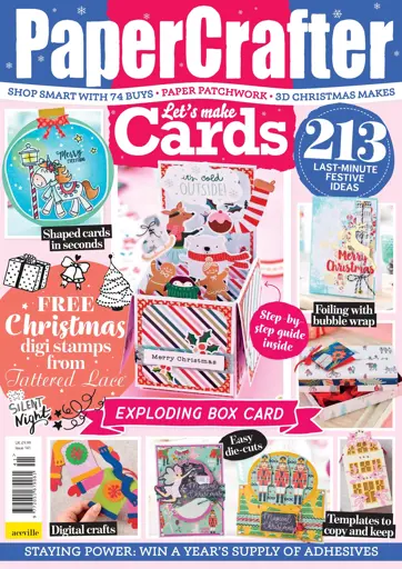 PaperCrafter issue 141 is on sale now! Let’s get straight to the point – you’re going to be obsessed with this month’s exclusive kit! Enjoy our 47-piece Crafter’s Companion Christmas bonanza, packed full of goodies brought to you by the lovely Sara Davies. On top of that, we’ve got your usual round-up of extras including 72 FREE Tattered Lace digi stamps and papers. Plus, enjoy 213 last-minute Christmas ideas and take a masterclass in a range of techniques from bubble wrap printing to exploding box cards.