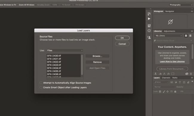 To merge your images to focus stack in Photoshop, click on File>Scripts>Load files into Stack. In the dialogue box that appears, select your files and click OK. Keep files in the order they were shot.