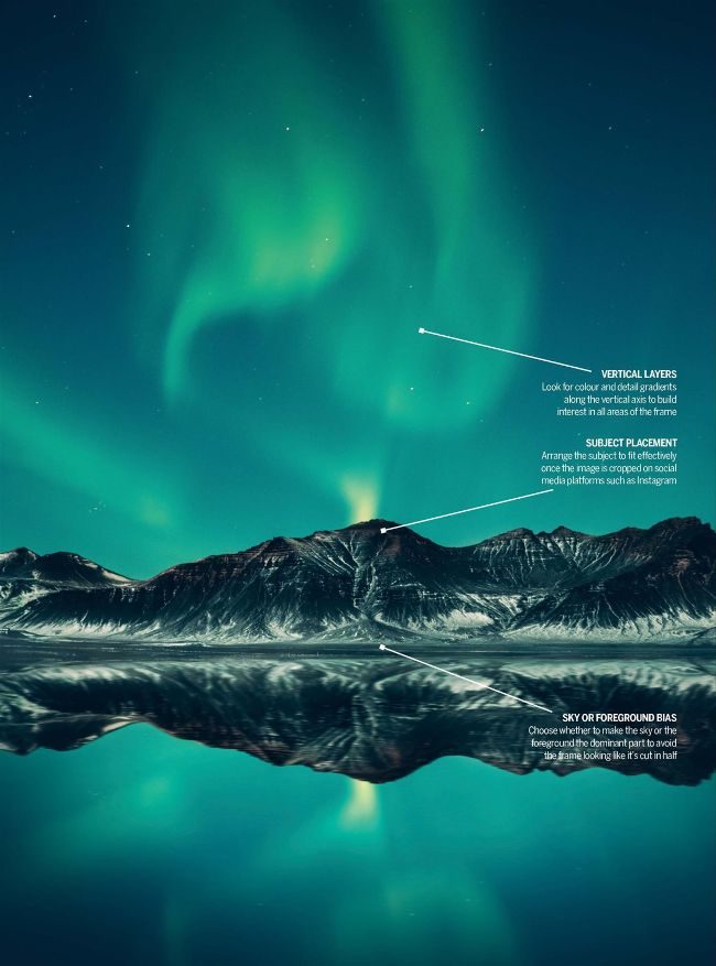 TIGHTER FRAMING Wide-angle lenses can easily produce excessive space above or below the horizon. Consider longer focal lengths to compress the elements