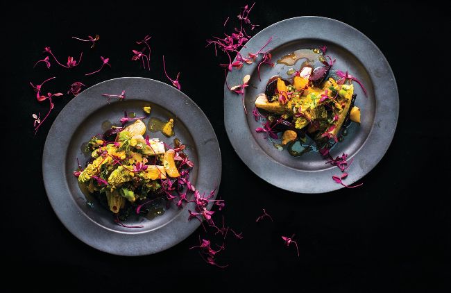 2To make the dressing, add the pistachios and the zest of the orange into a bowl. Then chop the orange segments up into small pieces and squeeze what is left of orange into the bowl. Slice the spring onions on a slight angle and add to the bowl. Chop the mint and then add the coconut sugar, salt and olive oil.