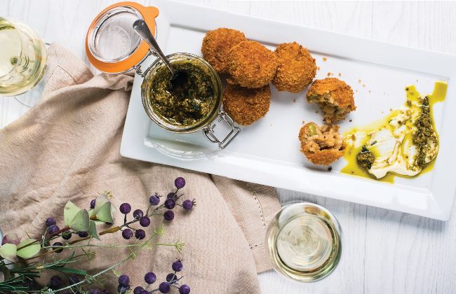 BROAD BEAN, PEA & COCONUT ‘BACON’ ARANCINI