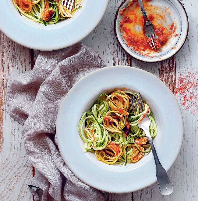 • Use a mandoline: Most mandolines have special julienne blades that let you make perfectly even slices. By running the chosen vegetable lengthwise over it, you’ll have beautiful spaghetti in no time. They’ll be a bit stiff at this stage but will soften when cooked. Even without the perfect blade, you can still set your mandoline to a fairly thin thickness; slice the vegetable into strips (watch your fingers!), then cut tagliatelle to the desired width or, if you’ve got the time and the energy, into spaghetti.