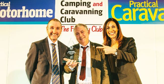 Clive receiving an award from Julia Bradbury and Simon McGrath of The Camping and Caravanning Club